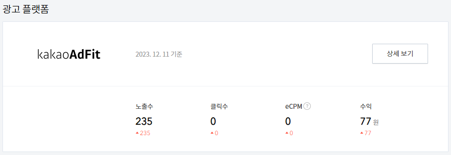 드디어 하루가 지나고 12월 12일 광고 플랫폼에서 수익을 인증받을 수 있었다.