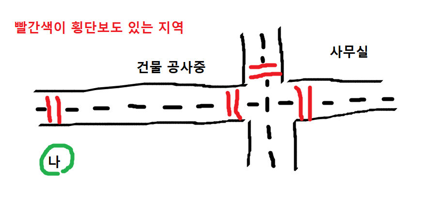 참고로 내가 사무실로 진행해 가는 방향의 정면에는 횡단보도가 없다.